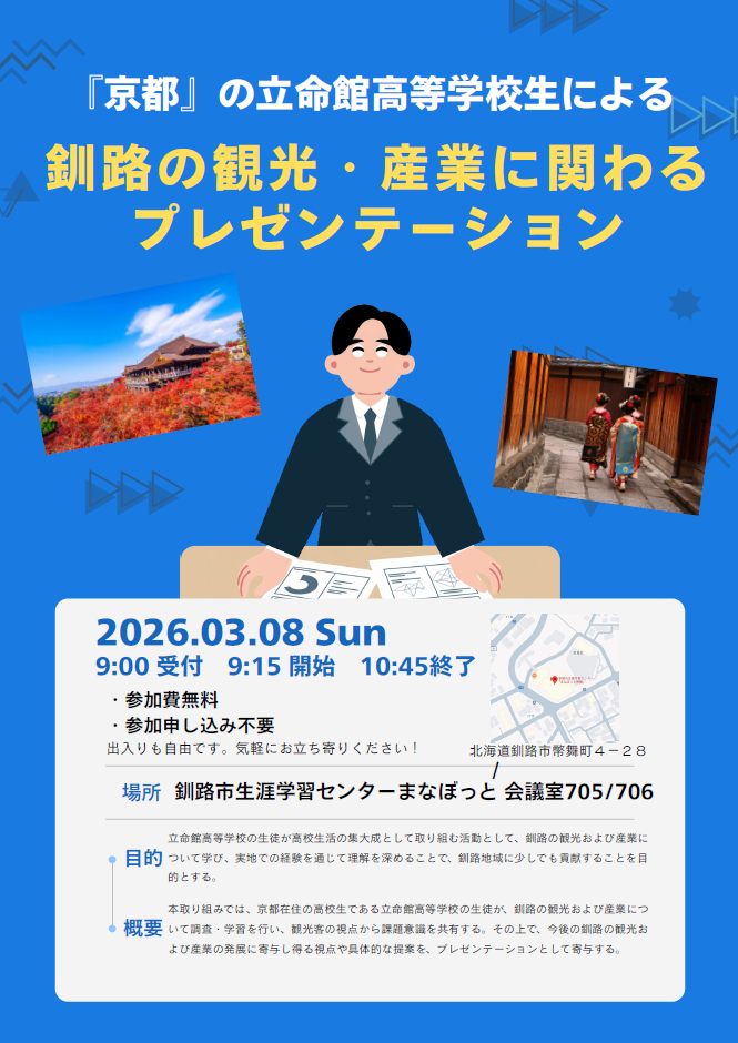 京都の立命館高等学校の生徒さんが、来月3月に釧路を訪れます☺